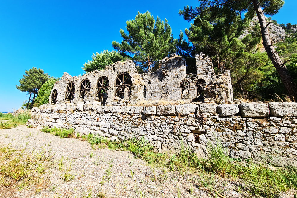 Город Олимпос расположен в 25 км от Кемера у подножия горы Тахталы (второе название Олимпос). Он выстроен в глубине длинной узкой гавани, которая образована рекой, пробившей себе путь сквозь горы. Когда-то река была полноводной, по ней могли проходить корабли. Сейчас она обмелела и большую часть времени представляет собой брод, наполняясь водой лишь по весне. Рядом с руинами расположены два посёлка: Чирали (спокойный курорт для семейного отдыха) и Олимпос, который облюбовали бэкпекеры и хиппи.