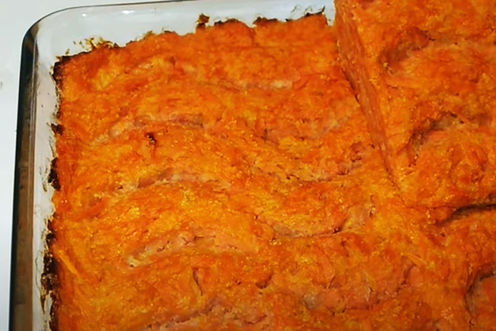 Это нежирное лёгкое блюдо. Представляет собой запеканку из варёной моркови, которую перетирают с яичными желтками, корицей и сахаром до пюреобразного состояния, после чего пекут в духовке.