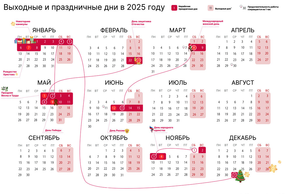 Предпраздничными днями в 2025 году станут 7 марта, 30 апреля, 11 июня и 1 ноября. Продолжительность работы в эти дни должна быть уменьшена на час.